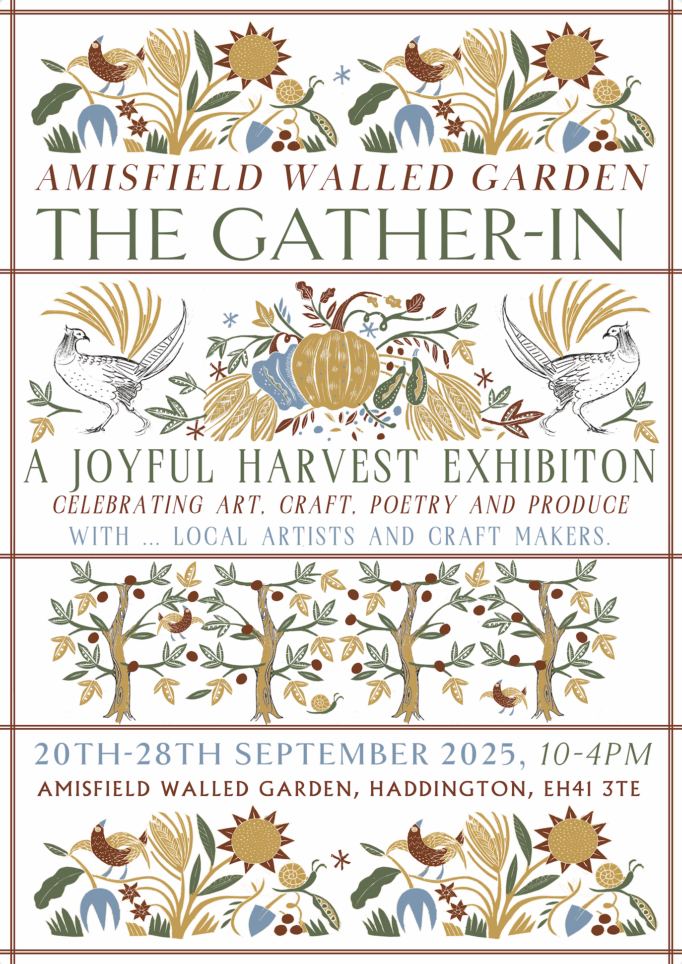 This new group exhibition brings together fifteen local artists and makers in a seasonal celebration, set within the beautiful surroundings of the historic Amisfield Walled Garden. The exhibition includes work across a variety of media – from ceramics and sculpture to embroidery, painting, poetry, wood engraving, botanical art and more – all thoughtfully curated to reflect the garden’s changing landscape and the spirit of harvest.
