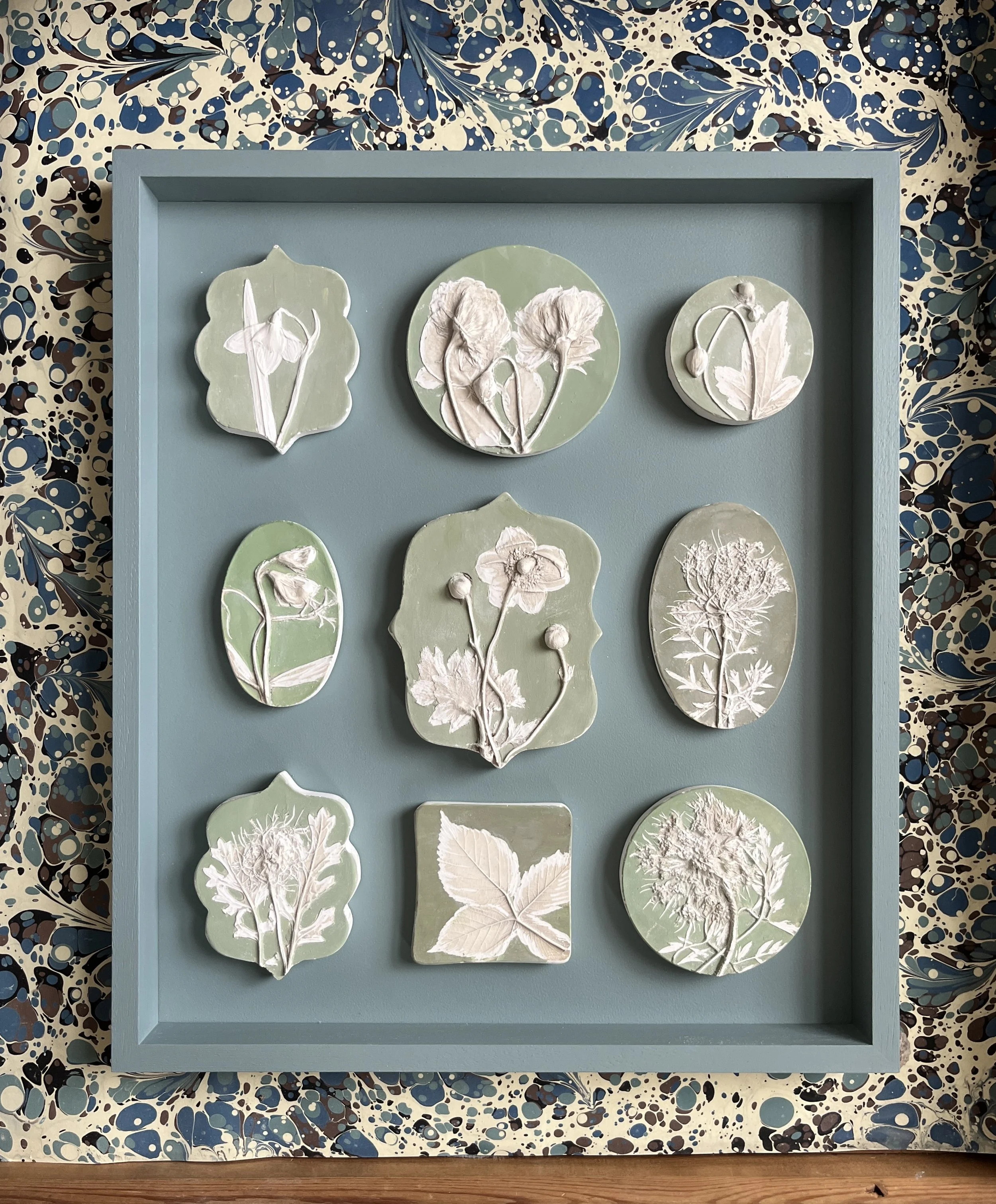 This new offering features framed botanical intaglios, hand-painted scalloped edge casts in both small and large sizes, and an elegant new style of slim floral portraits – each one hand-finished and framed in beautifully coloured box frames.