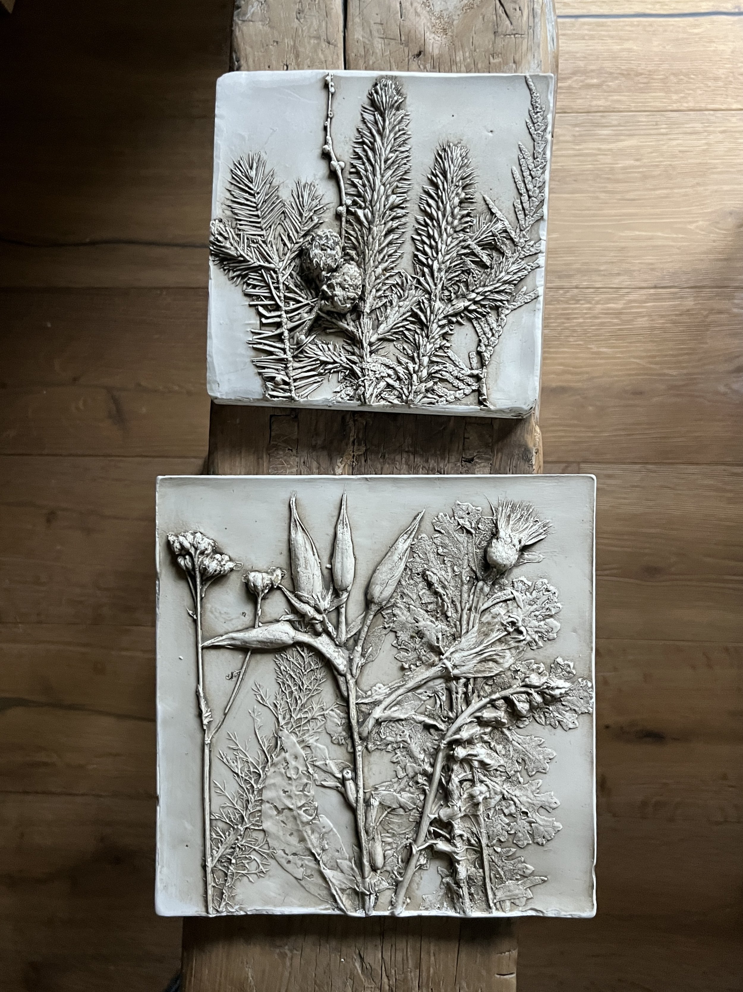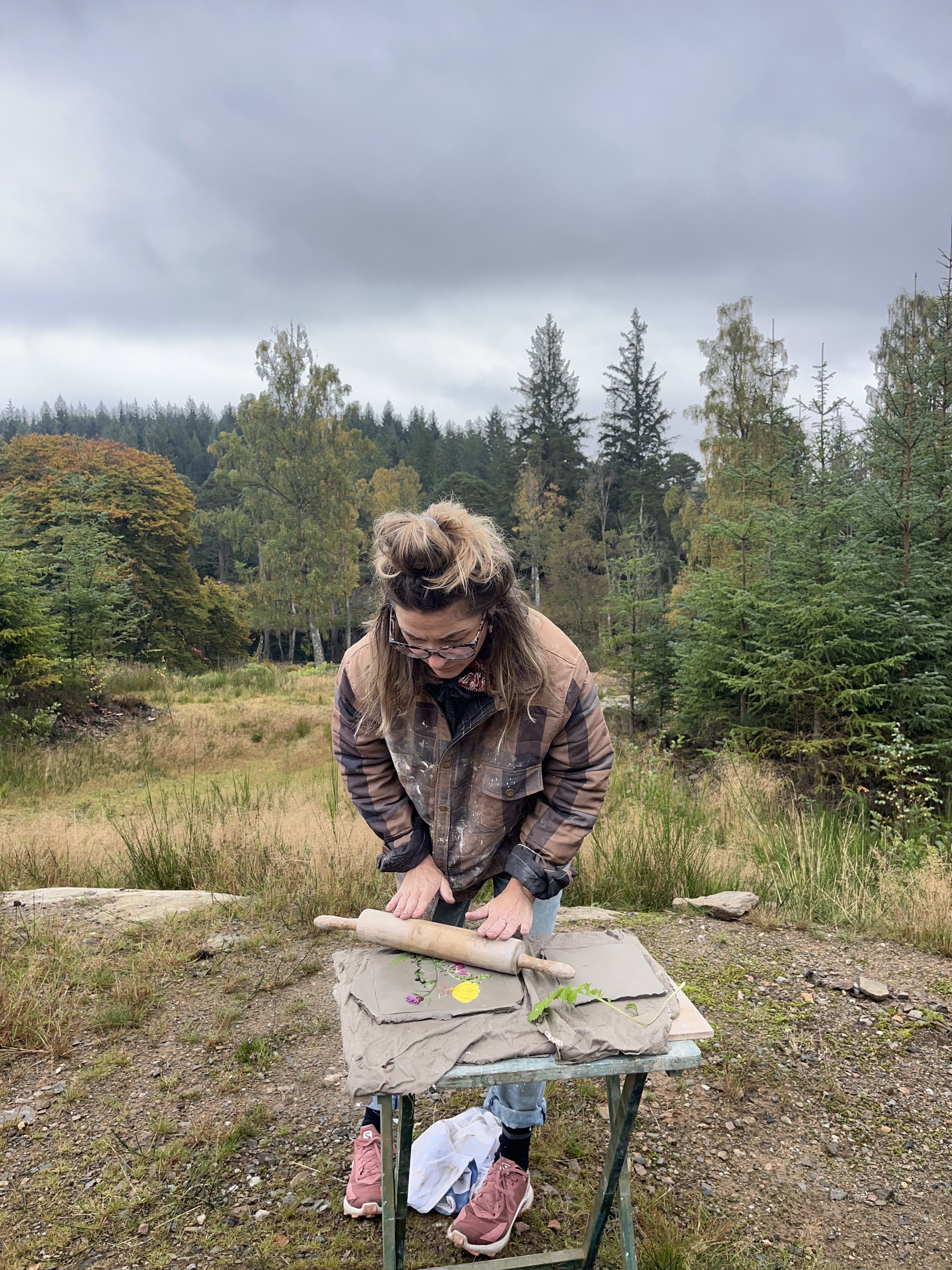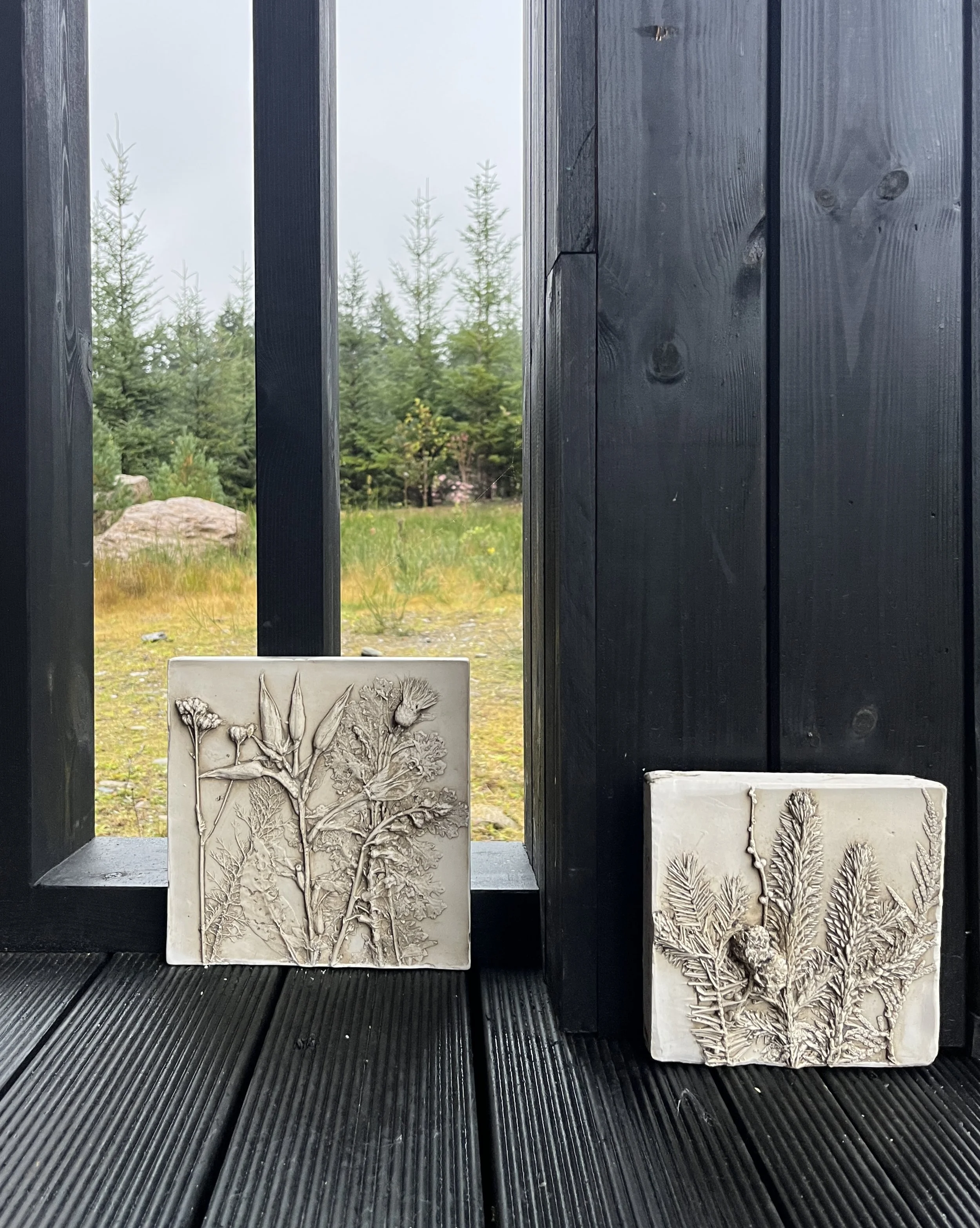 Pinto and I spent many hours exploring the woodlands around Atholl Estate, gathering botanical specimens to create a series of work capturing a moment in the seasonal life of the forest. I was particularly drawn to the firs, larches, and ferns that were abundant along the trails, alongside some stubborn foxgloves and evening primrose. The path around Cally Loch was alive with mushrooms and toadstools — which sadly don’t cast very well — but there were plenty of horse chestnut seed heads scattered across the woodland floor, as well as some beautifully textured bark that I collected to experiment with.
