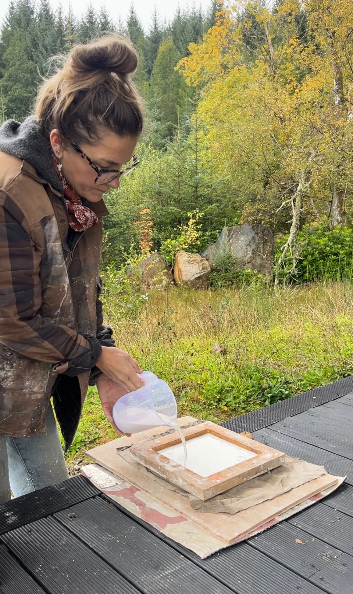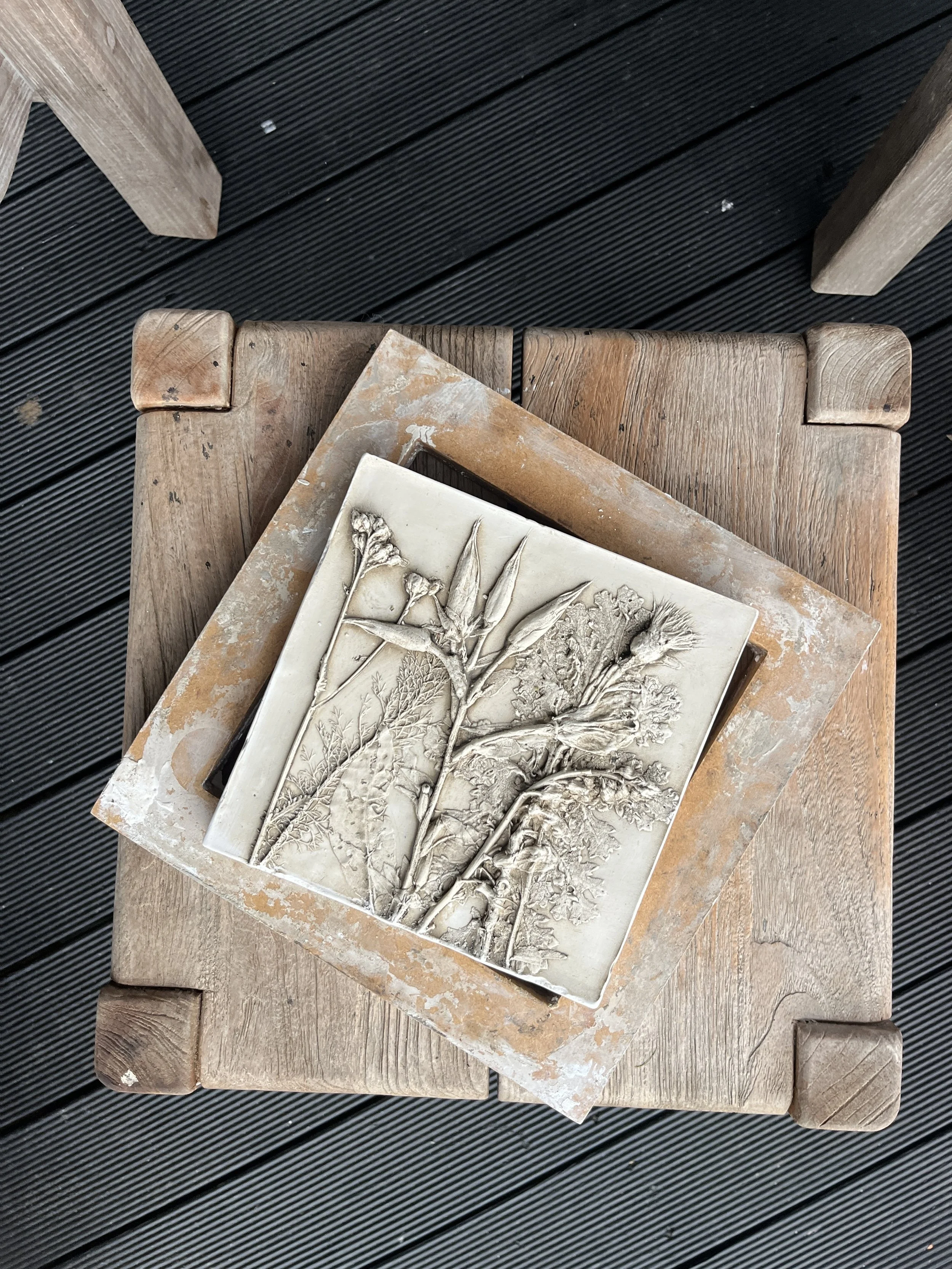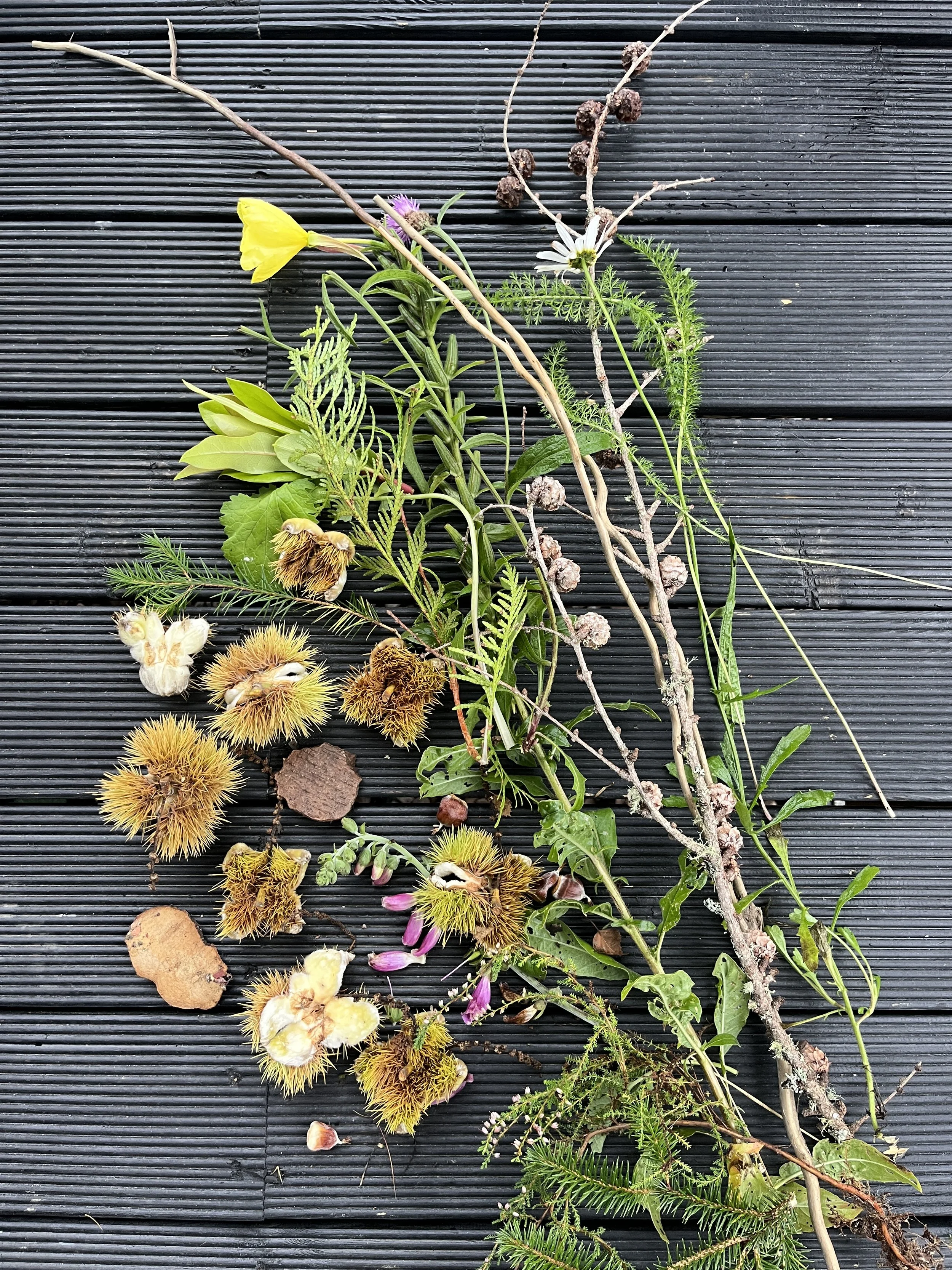 Pinto and I spent many hours exploring the woodlands around Atholl Estate, gathering botanical specimens to create a series of work capturing a moment in the seasonal life of the forest. I was particularly drawn to the firs, larches, and ferns that were abundant along the trails, alongside some stubborn foxgloves and evening primrose. The path around Cally Loch was alive with mushrooms and toadstools — which sadly don’t cast very well — but there were plenty of horse chestnut seed heads scattered across the woodland floor, as well as some beautifully textured bark that I collected to experiment with.